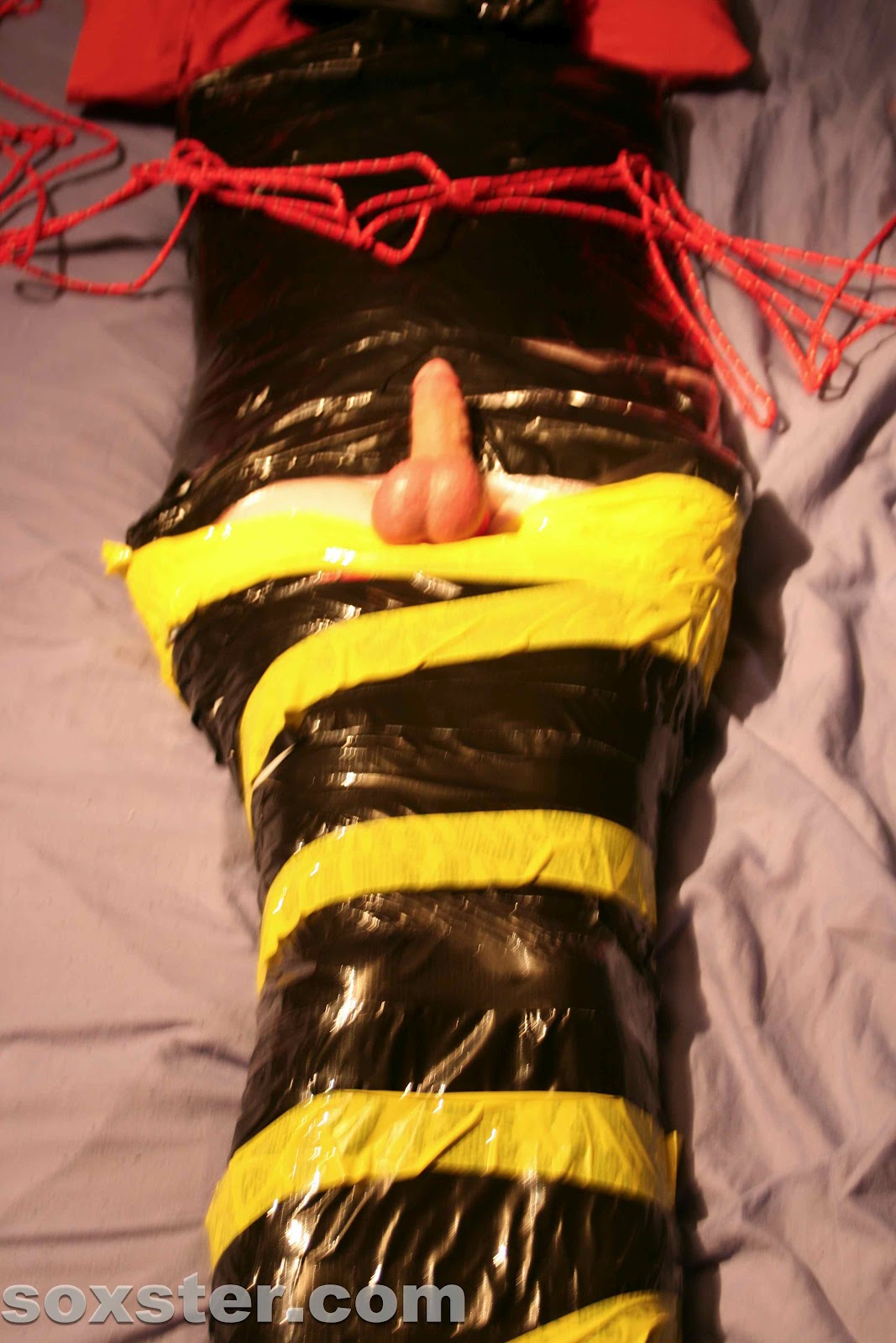In this session the boy had cling wrap from the neck down, with a layer of black duct tape, with yellow tape highlights.Ā Full leather hood with breathing holes only.