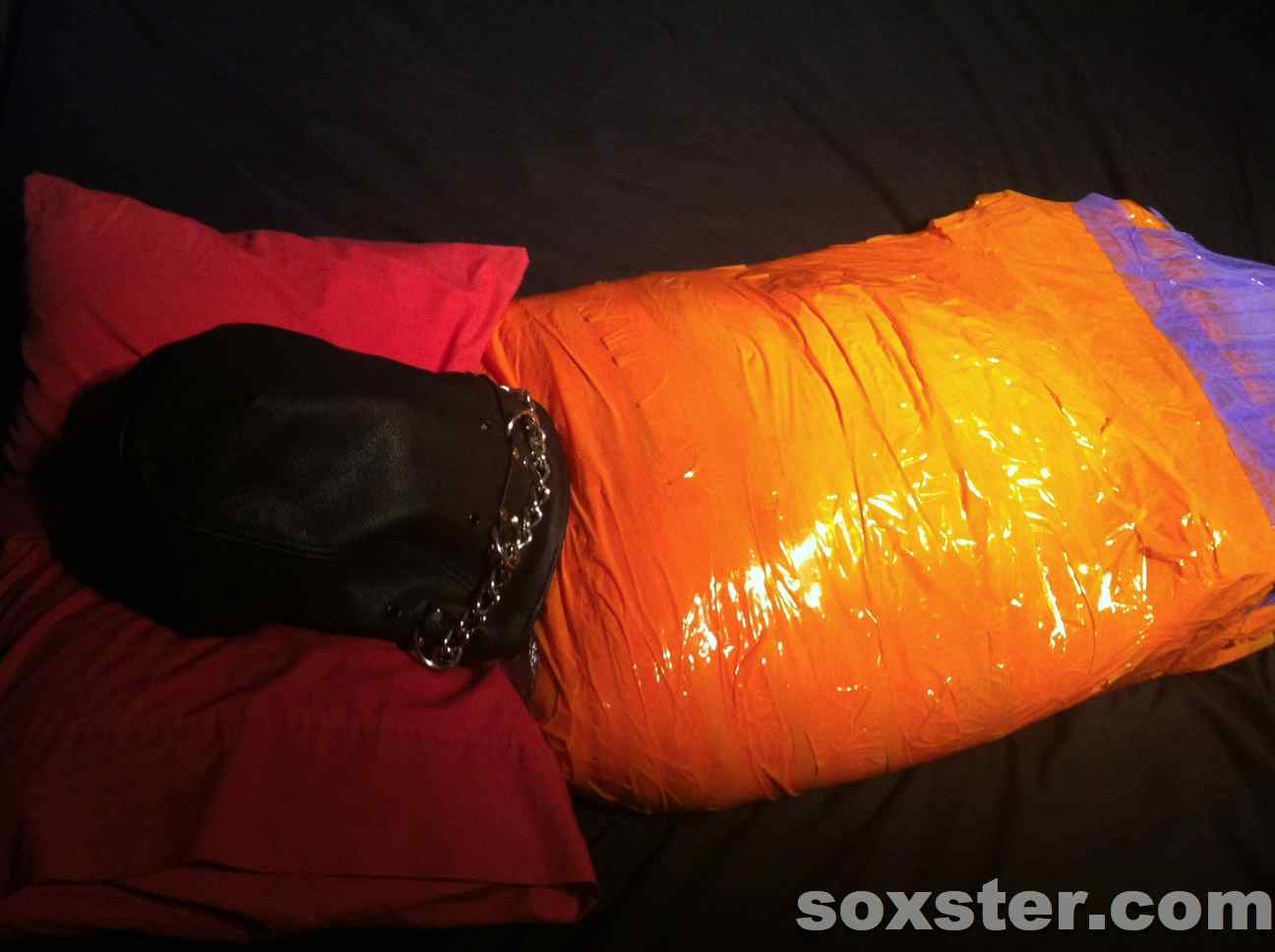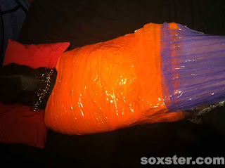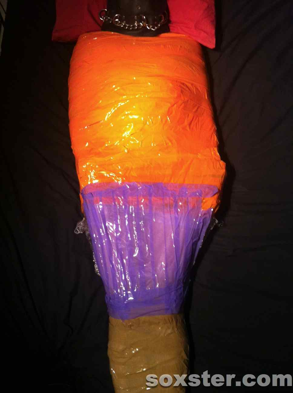 A sudden rip of sound and I was being covered in a plastic film. As he worked from my next down to my waist he got faster. His expert hands covering every inch with precision. I could not see it but could feel the care and attention that he was giving to the task. Then a sharper sound – tape this time. Again the same precision and care applied to ensure that there was no scope for manoeuvre. He twisted me around and then he pushed me – telling me I would fall. I had no sense of distance or space. I fell on my side. I had no control but I felt safe. You would not know from my heart beat. The same followed with my legs and feet. First the film until covered fully. Then the tape. The shallow pillow was removed and a larger firmer one put in place. The heat internally was incredible.